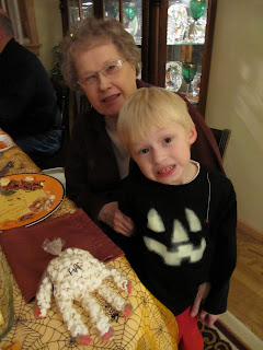 More cupcakes: and for people that wouldn't like the monster cakes.....I picked up some regular cupcakes too. Aaron with his grandma..................and the fun creepy hand he made at school.
